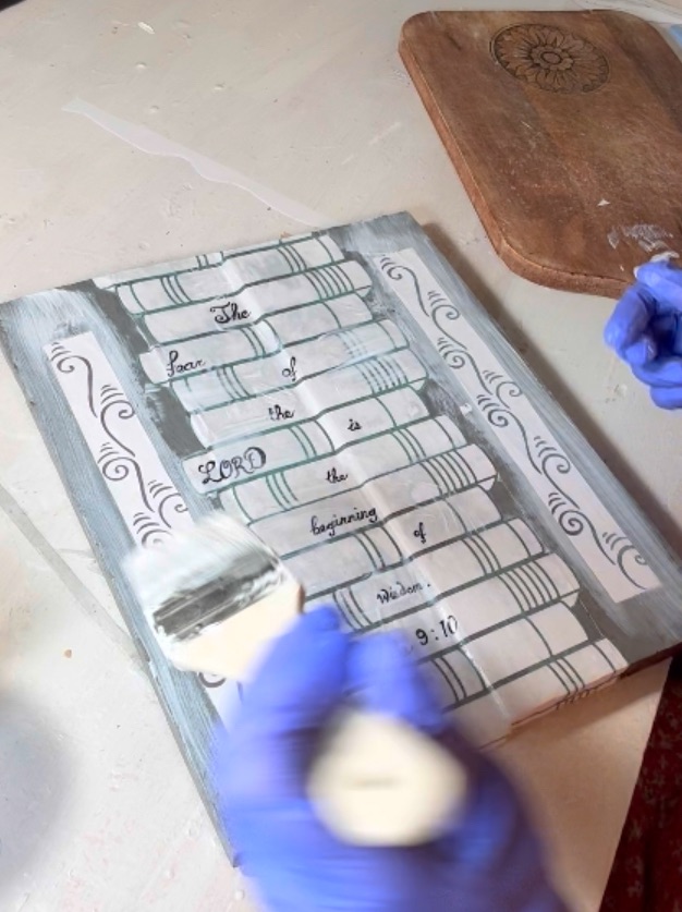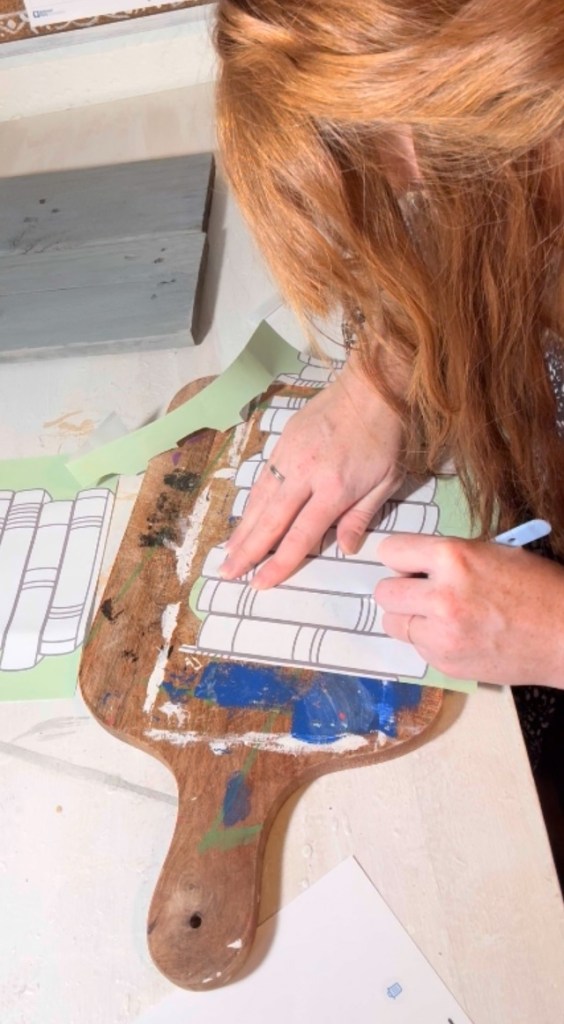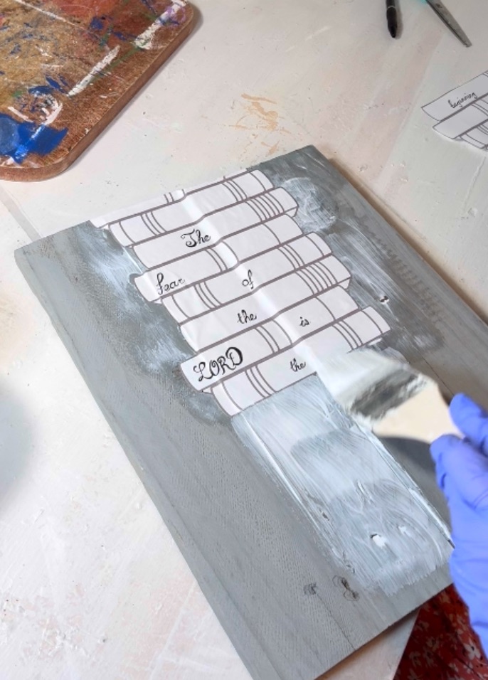 Once I had the words written out, I carefully used Mod Podge to glue the paper book stack design onto my wooden sign. I worked slowly so the paper would dry smoothly against the wood and become part of the background. After it set, I also added two little art decals to the sides, sealing them down with Mod Podge as well.