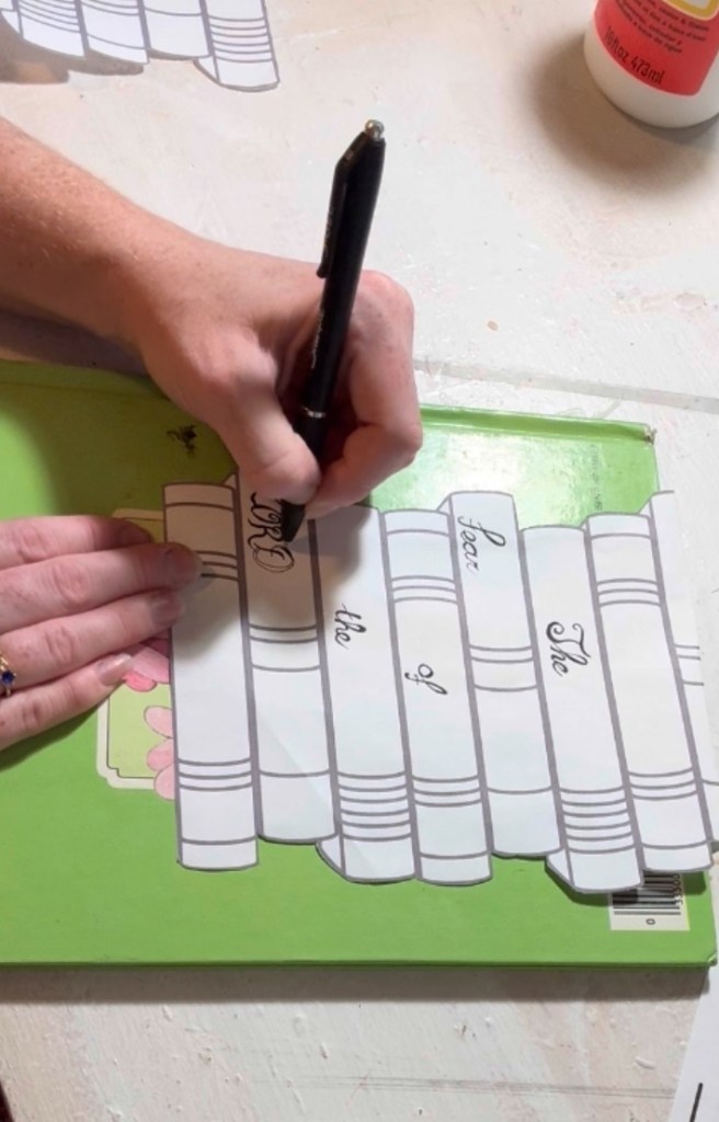 I wanted to display the verse in a unique way, so I printed out a simple template of stacked books. The design was intentionally minimal, almost like blank book covers, which gave me space to handwrite the verse across the “spines.” Each part of the verse flowed naturally from one book to the next, almost like you’re reading down a stack of wisdom-filled volumes.