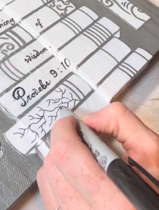 After everything was completely dry, I wanted to highlight the details and tie it all together. Using a silver marker, I added delicate accents around the books, and then went in with a black marker for a bit of extra definition. The silver worked beautifully with the gray-whitewashed background, giving the piece a subtle, elegant look.