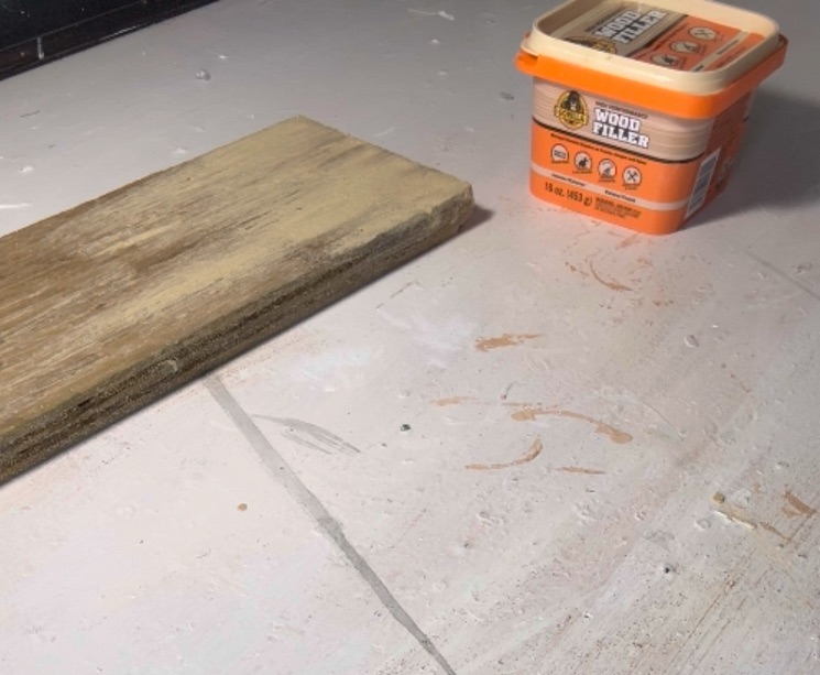 The wood I used was pretty rough and had some chips on one corner. Instead of tossing it, I grabbed a little bit of wood filler and patched the corner. I didn’t even bother sanding the whole piece—the rustic, rough look felt perfect for this project.