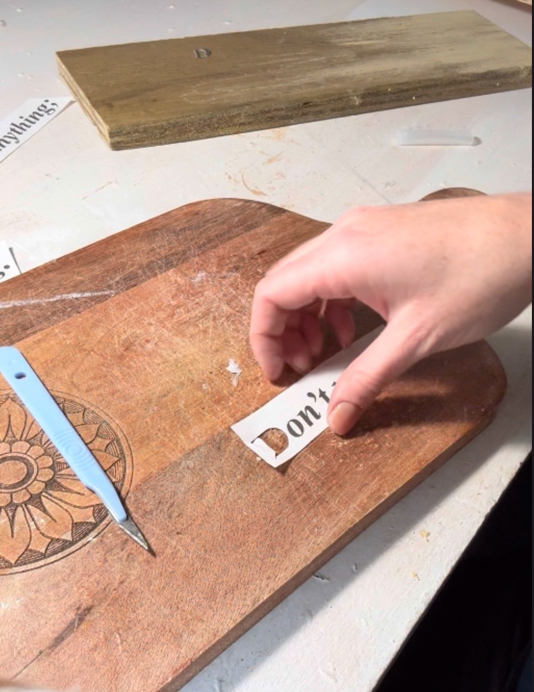 For the wording, I typed the quote into Google Docs, printed it off, and carefully cut out the letters with a craft scalpel. Then I mod podged the letters onto the sign.