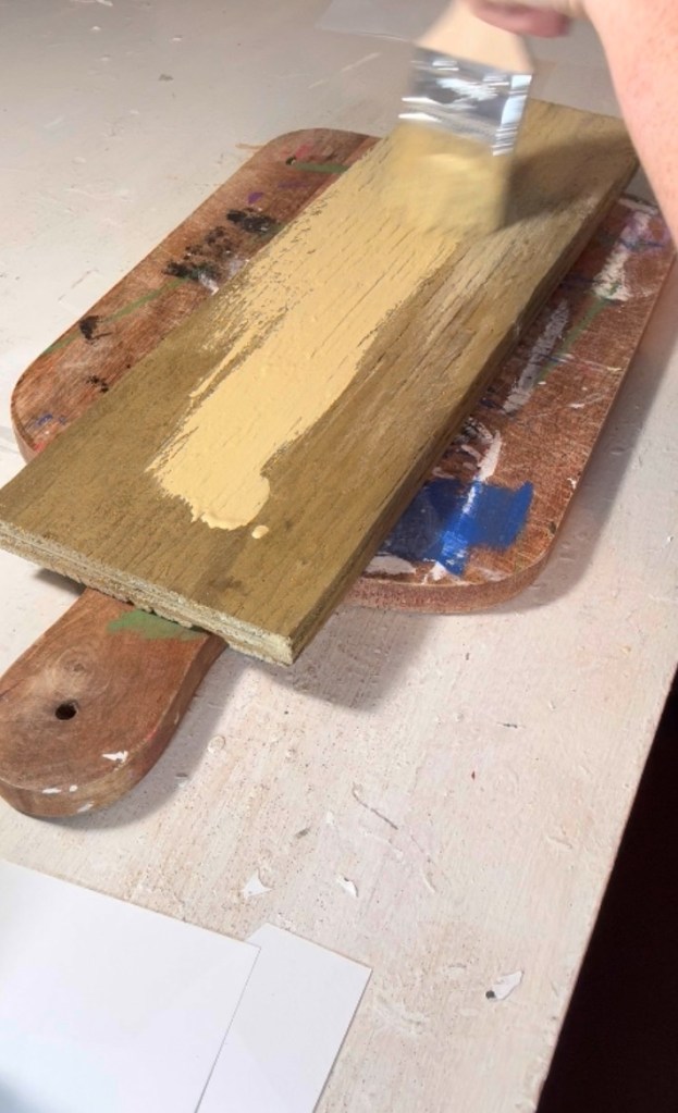 The natural wood color just wasn’t working, so I painted the entire sign a simple tan color. It gave me a nice, warm base to work with and softened the rough look of the wood.