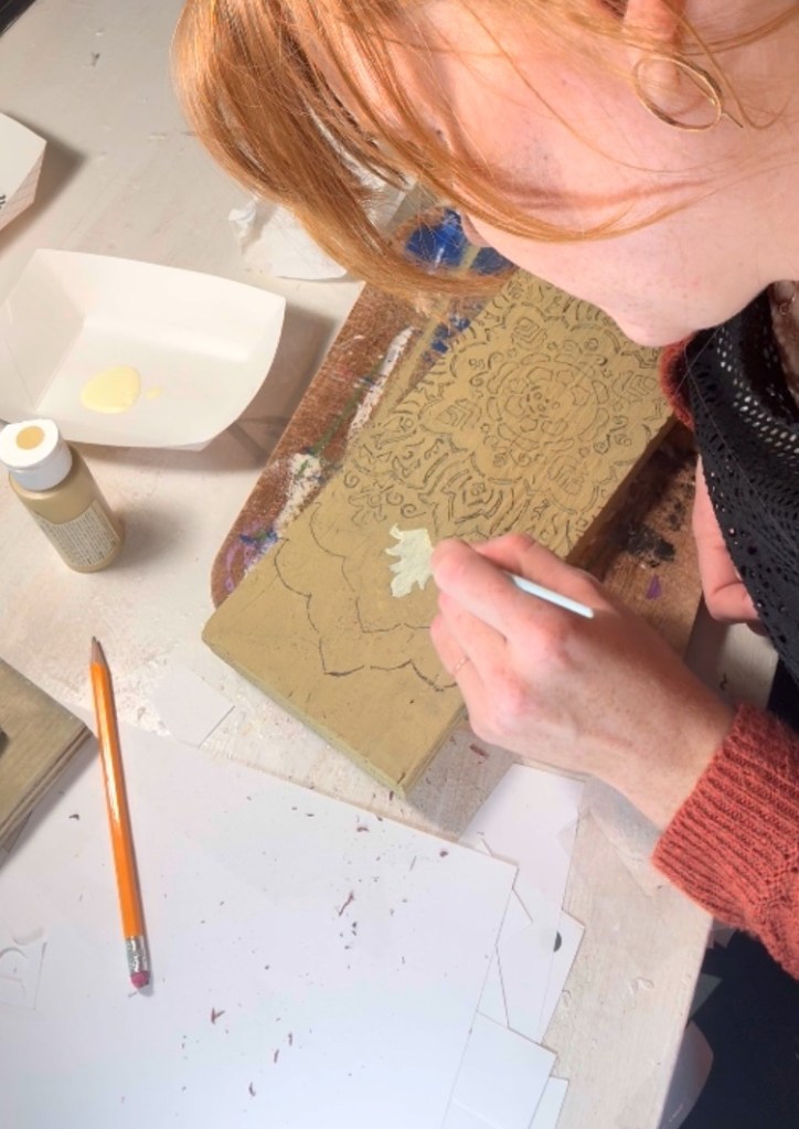 I wanted a background design to give the sign more character. Instead of painting directly through the stencil (which always seems to bleed underneath for me!), I placed the stencil down and traced the design lightly with pencil. Then I went back over the lines with white paint and a steady brush.