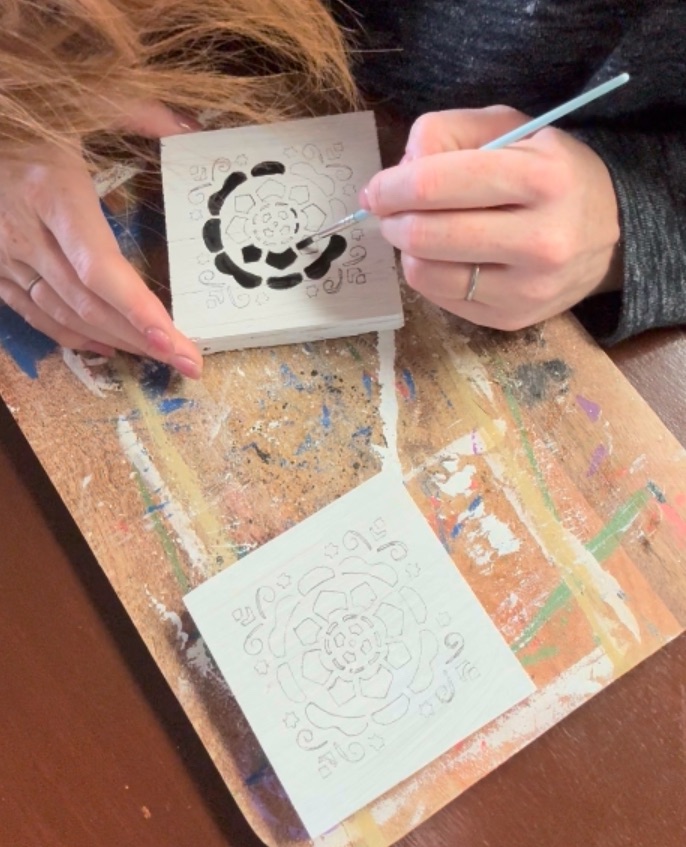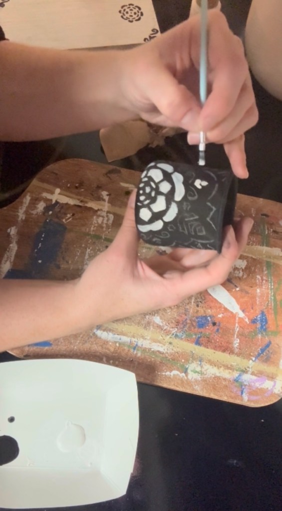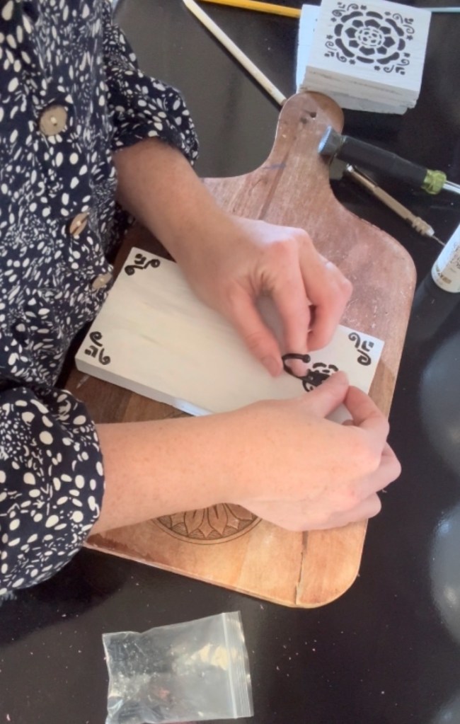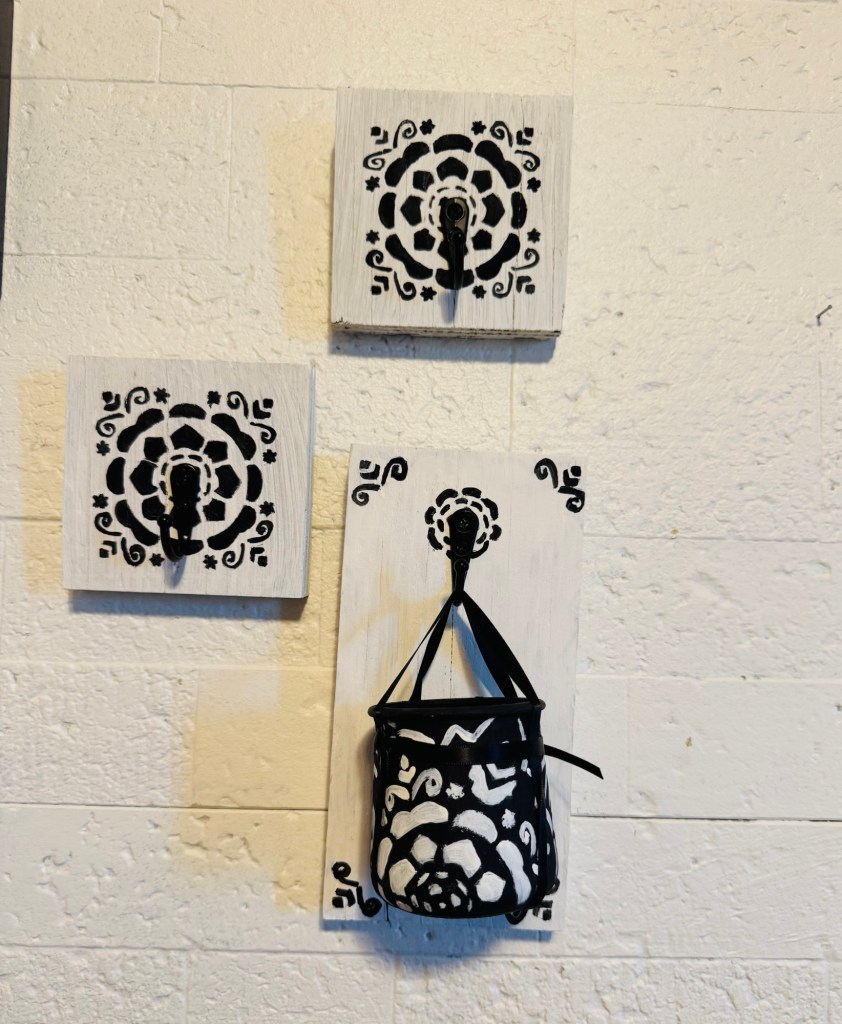 For the two square pieces, I started by giving them a coat of white paint. Once they dried, I penciled in a floral stencil design and then went over it carefully with black paint. The contrast of the black on white gives them such a clean, bold, and slightly rustic look.