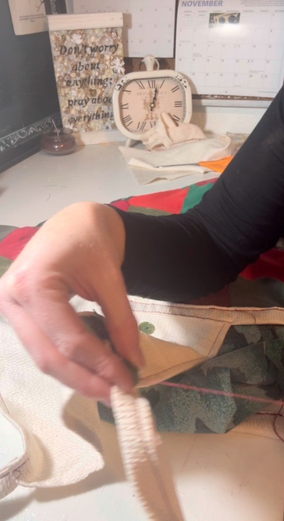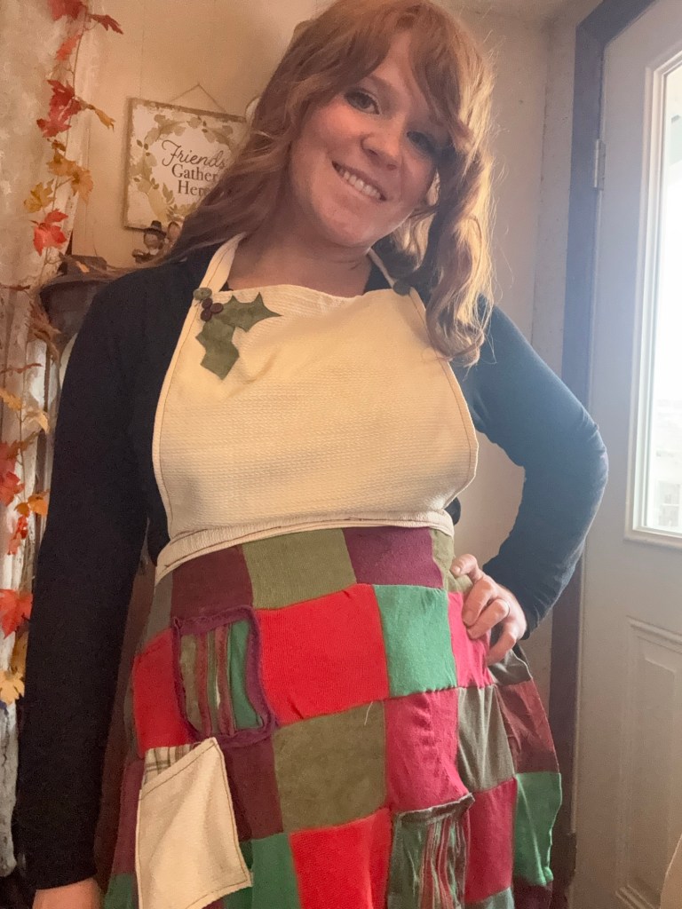 This apron didn’t cost me anything. It was literally made from old clothes that were just taking up space. There’s something so satisfying about creating something useful and adorable from scraps you’d normally throw away. And now I have a Christmas apron I can wear for baking, decorating, and all the holiday things.