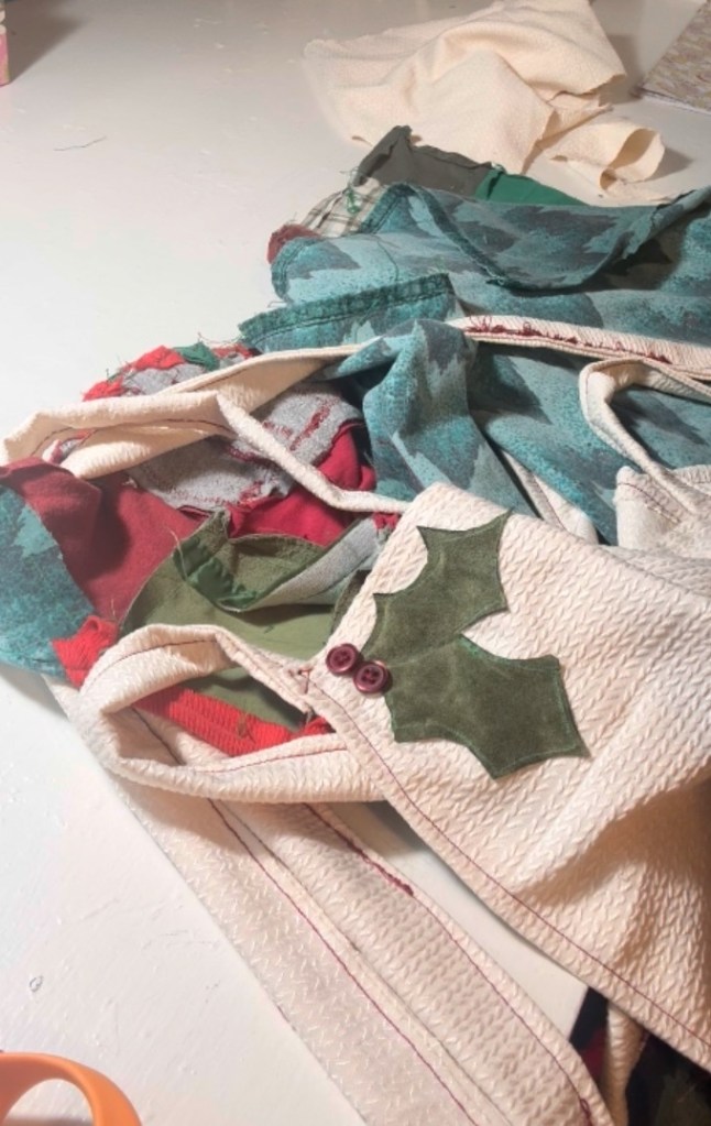 For the bottom half, I cut a bunch of red and green fabric into squares and made a little patchwork quilt section. Nothing fancy — just scrappy, simple, and really festive. I love how Christmas patchwork has that cozy, homemade feel to it. The mismatched patterns ended up working together better than I expected.