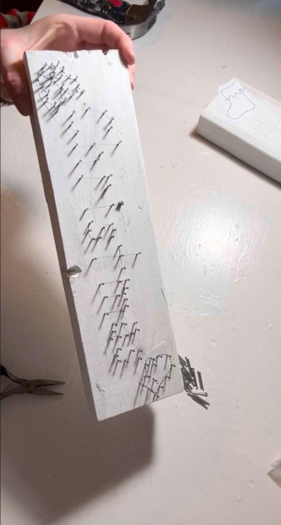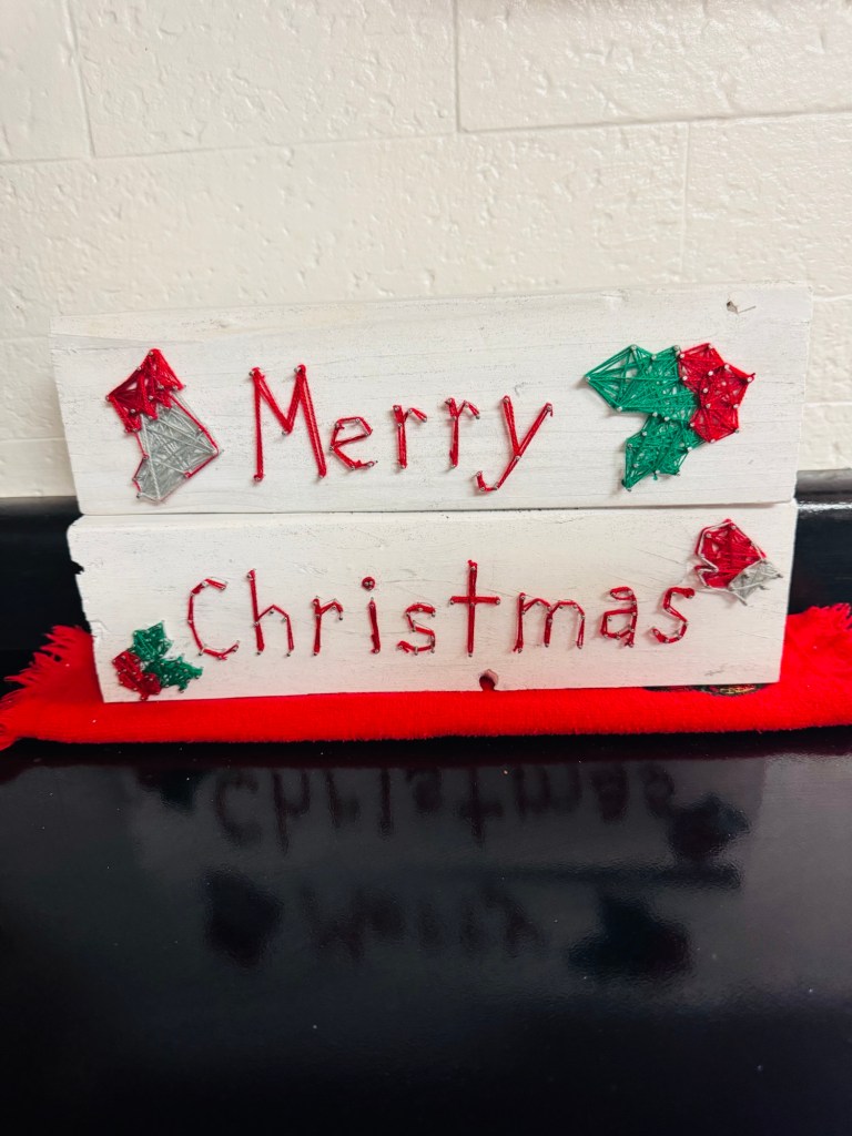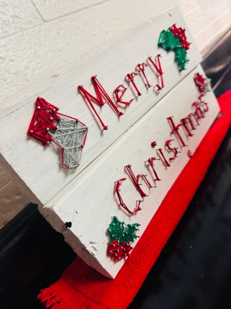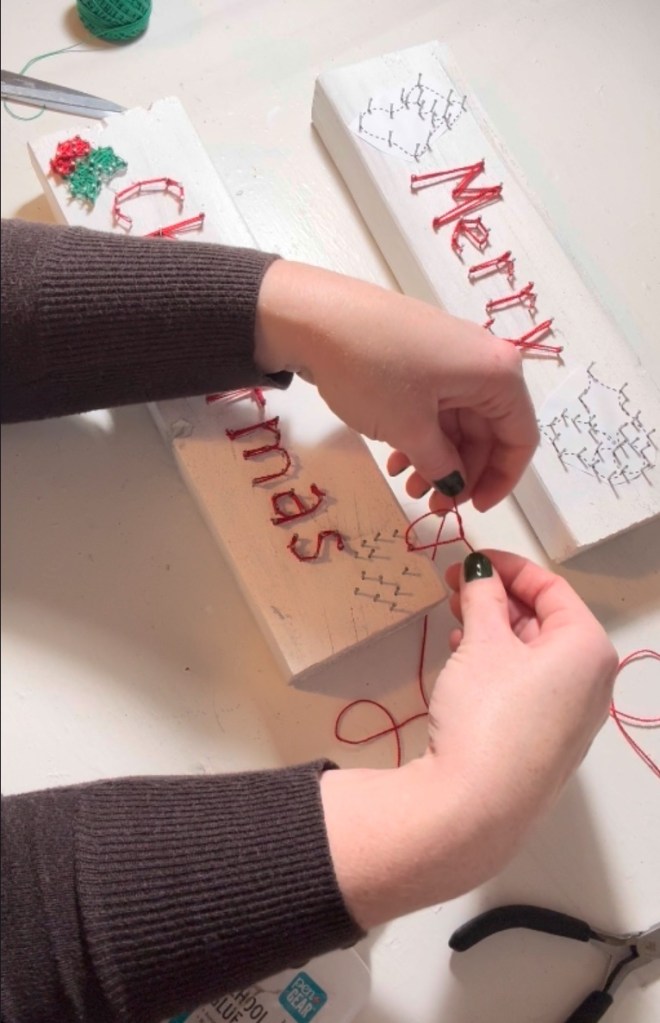 I found a small Christmas string art guide sheet that had tiny designs like holly, a mitten, and other festive shapes. They fit perfectly next to the words, so I added a string art design on each side of the lettering.