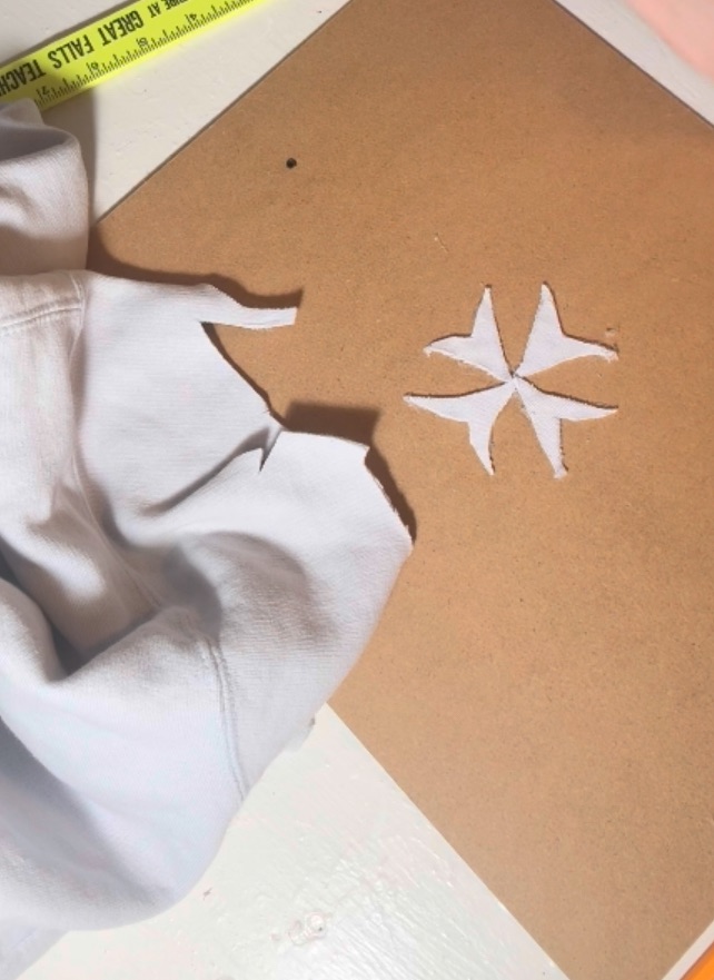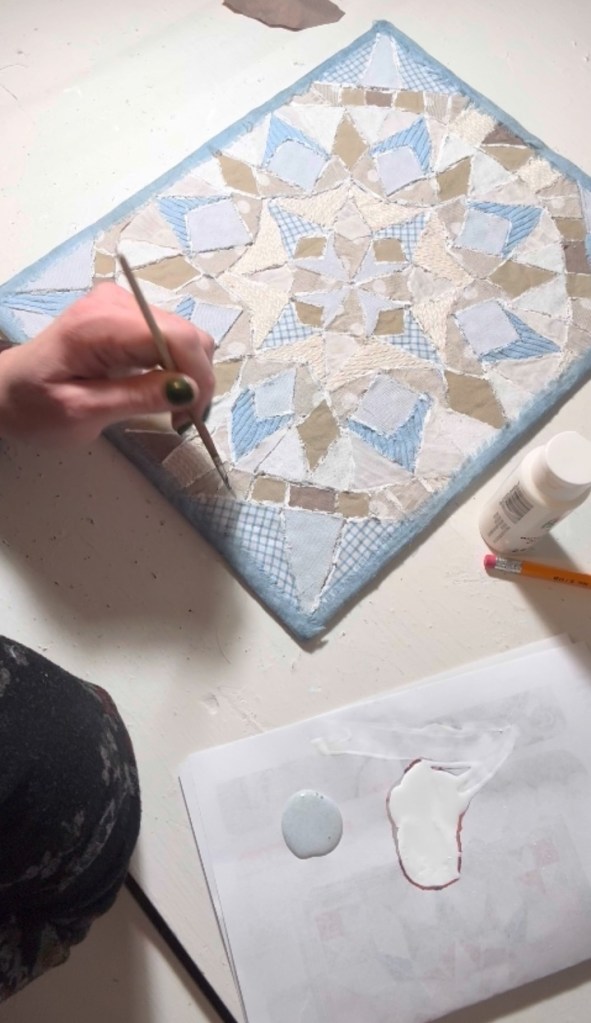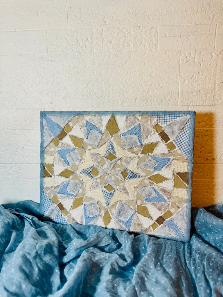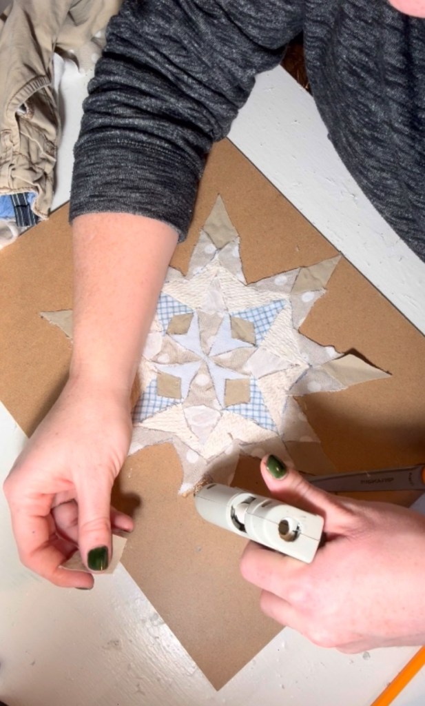 I cut my pieces and simply hot glued everything down, working from the center outward and following a loose pattern. There was no pressure to make it perfect — it honestly felt like doing a puzzle, except I was creating my own puzzle pieces as I went.