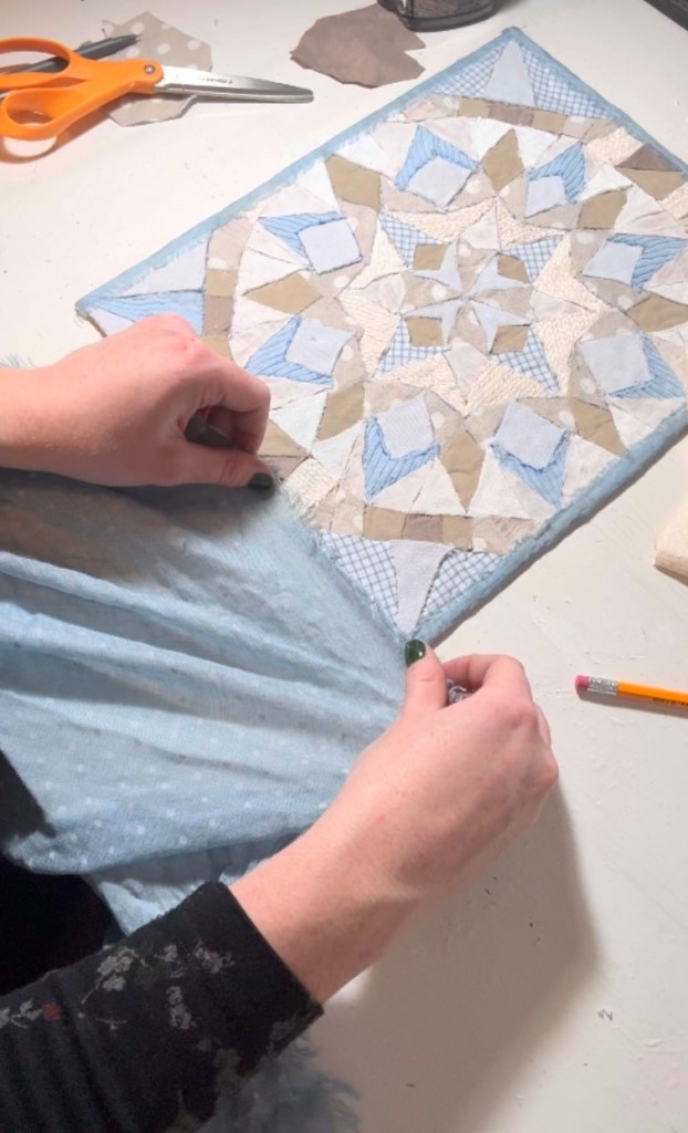 Once all the pieces were glued down, I needed a way to finish the edges. I had a piece of frayed fabric that already had a finished look along the edges, which worked perfectly.