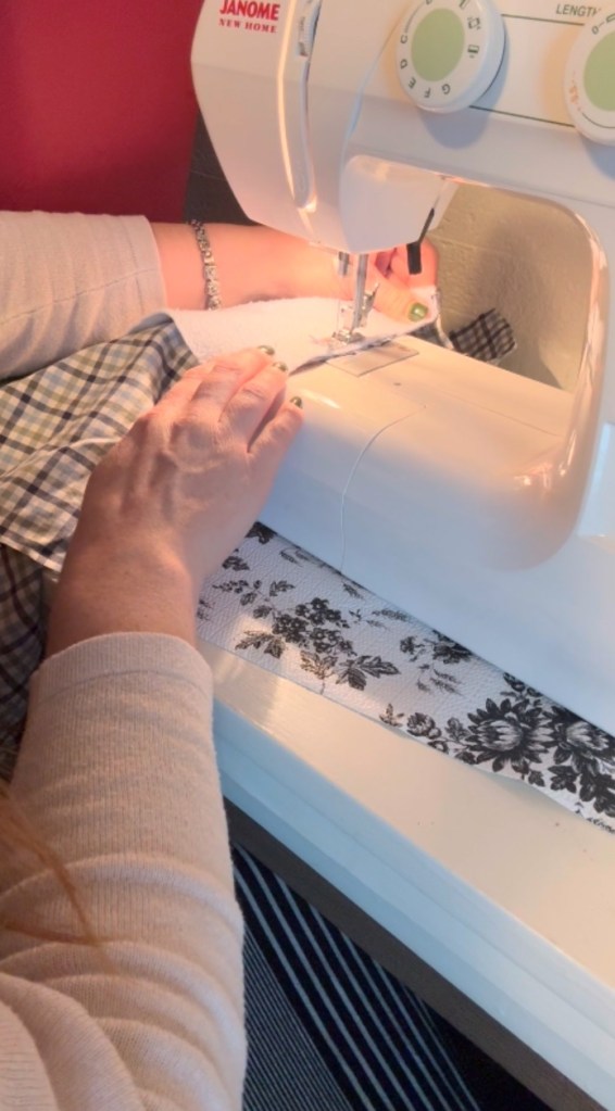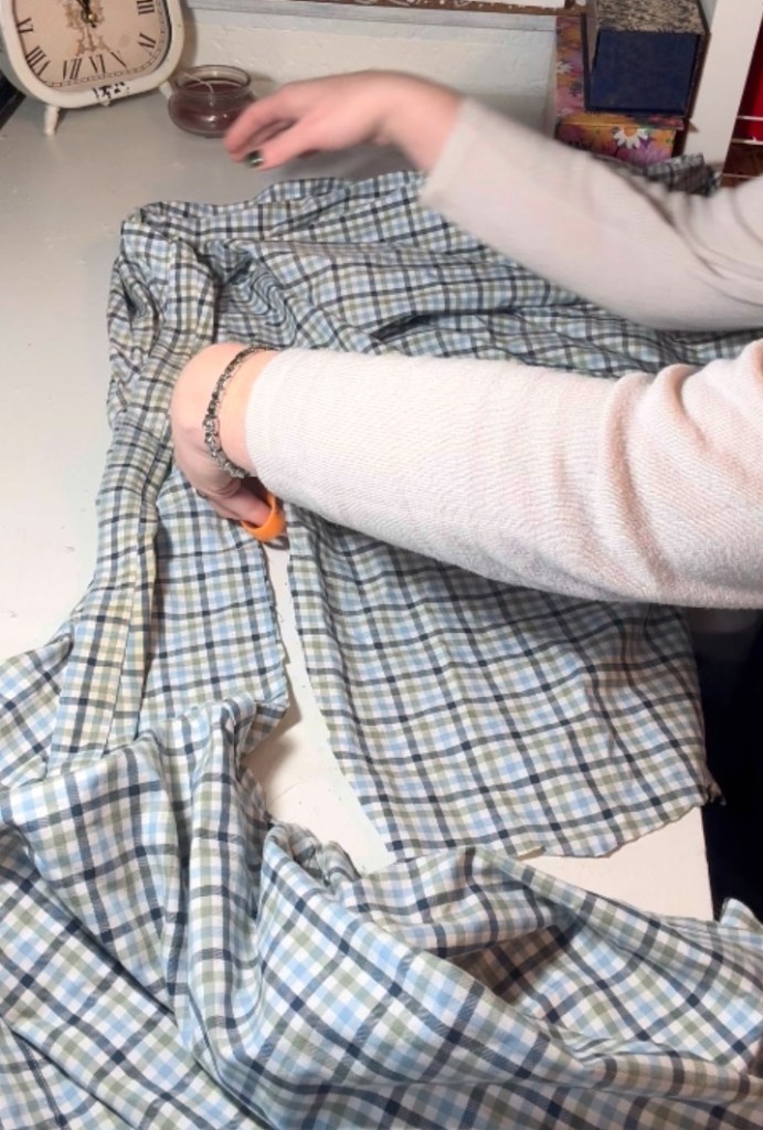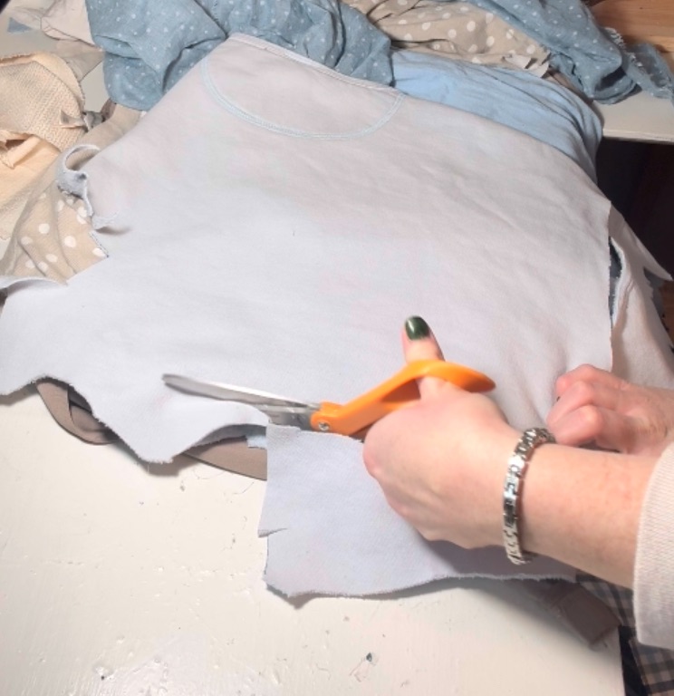 I cut the bottom portion of the apron out of the light blue plaid fabric. For the top portion, I used the baby blue sweatshirt material, which added a softer, cozier texture.