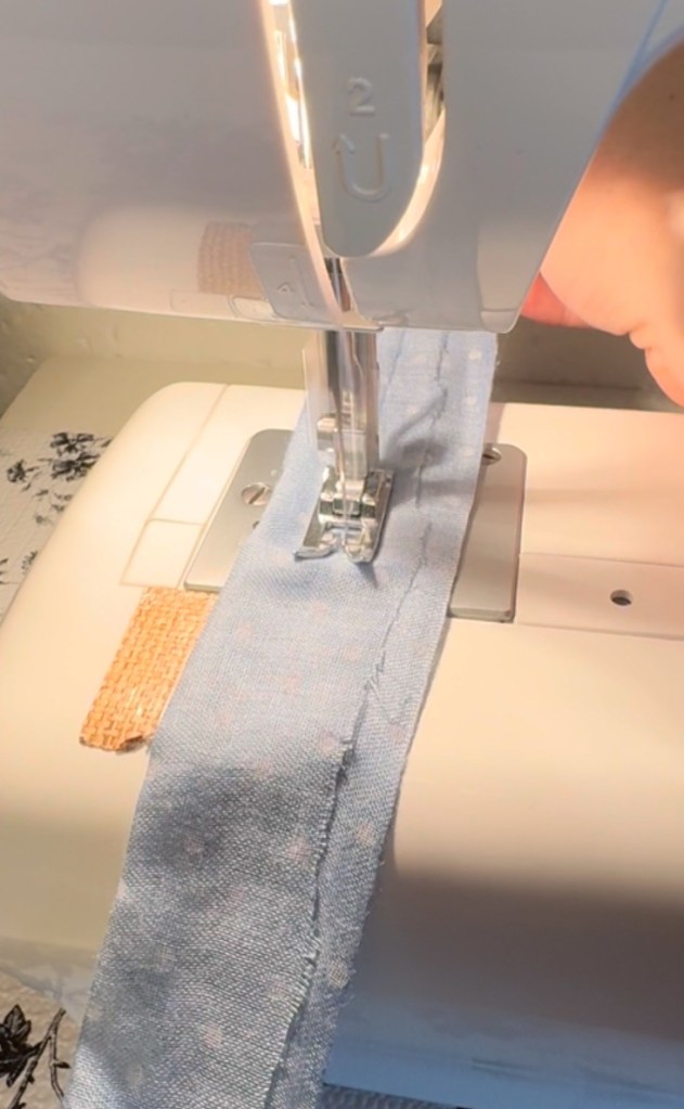 For the ties, I made simple fabric strings and sewed them directly onto the front of the apron. I did this both at the waist and at the top. I actually really liked how this looked — it created a soft visual transition from the plaid bottom to the light blue top instead of hiding everything in seams.