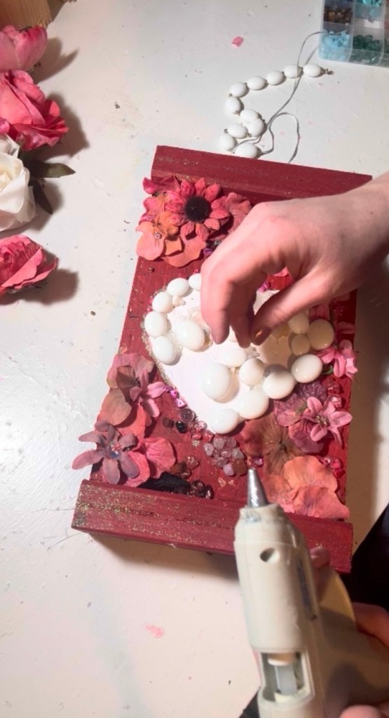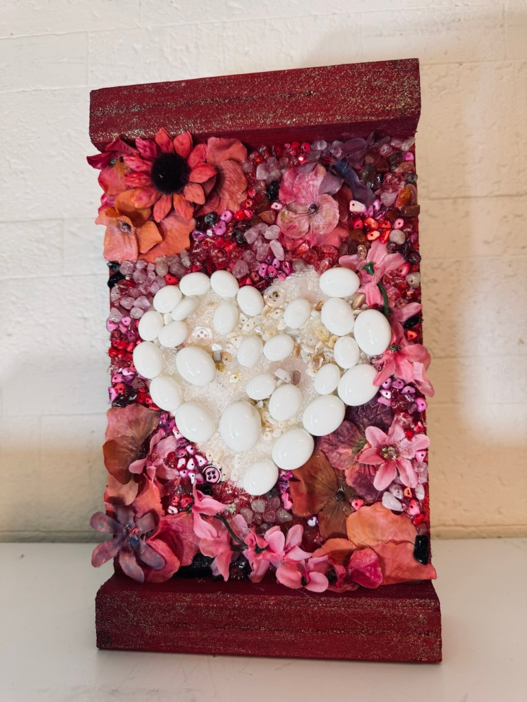 I filled the white heart with white beads, a few white rock-like pieces, and even a white button. For the red background, I used a mix of red, pink, maroon, and a few black beads here and there — whatever colors seemed to work together. I just kept filling in gaps until it felt finished.