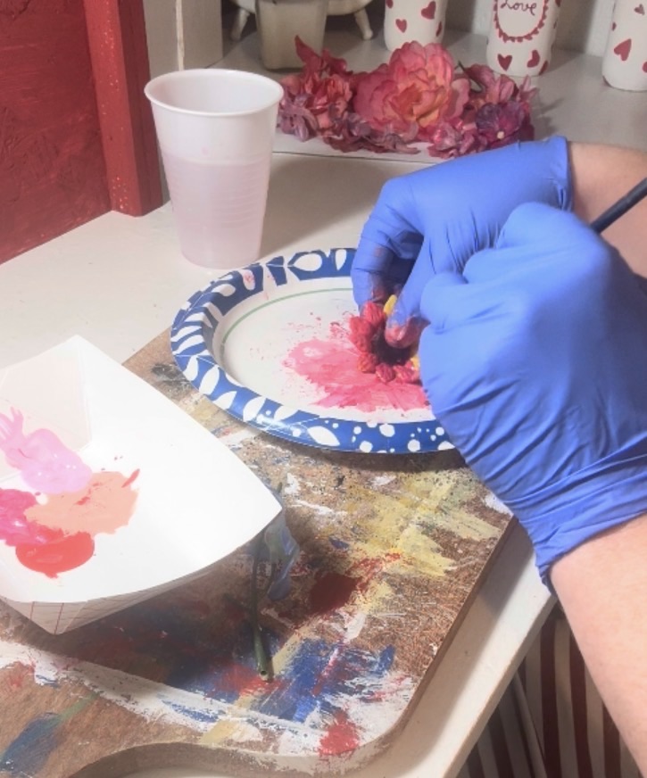 I had a small collection of faux flowers that didn’t really go with anything else I own — the random kind you keep moving from bin to bin. I painted them in reds and pinks and hot glued a few around the corners of the piece. Nothing perfectly planned or symmetrical, just enough to add a little texture.
