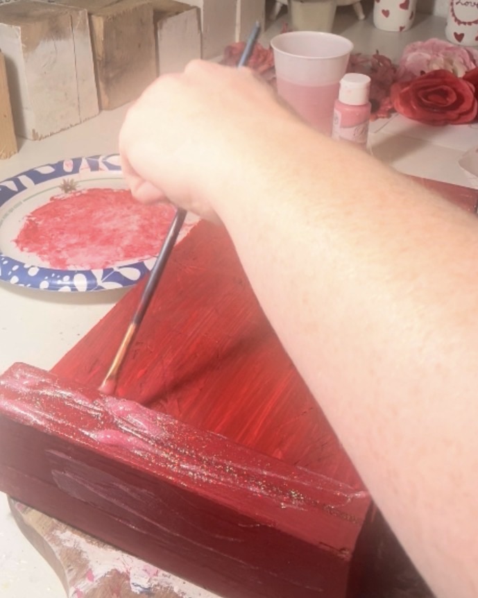 The I-joist piece already had some interesting shape to it, especially on the corners, so I didn’t want to overthink the design. I painted the main block red, then painted just the edges and corners with a soft, slightly shiny pink. The corners are raised, so the sparkle catches the light in a really subtle way that I ended up liking a lot.
