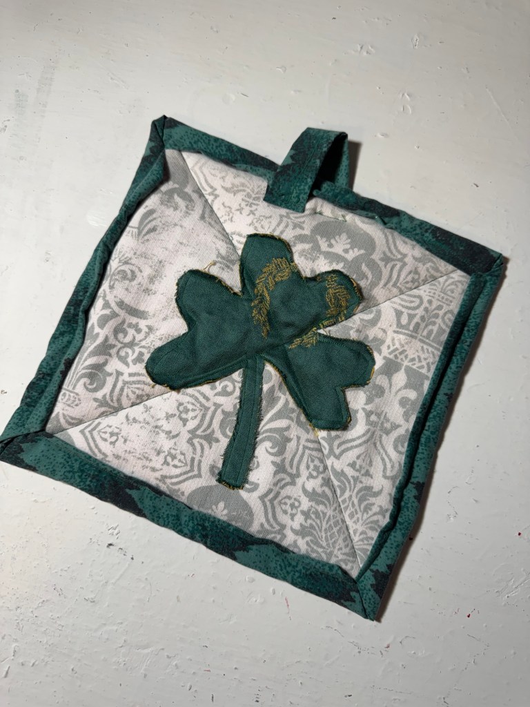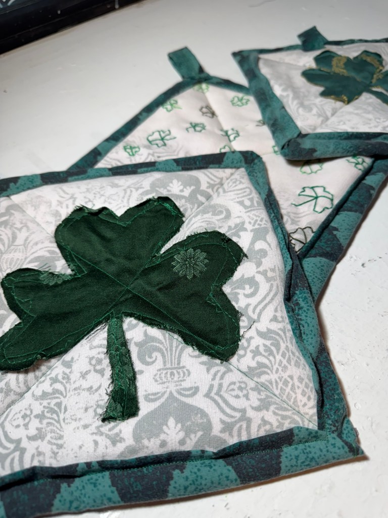 Two Shamrock Appliqué Potholders I had some really cute green fabric left over from a previous project, so I cut out large shamrock shapes and sewed them onto the front of two potholders. Simple, festive, and perfect for St. Patrick’s Day.