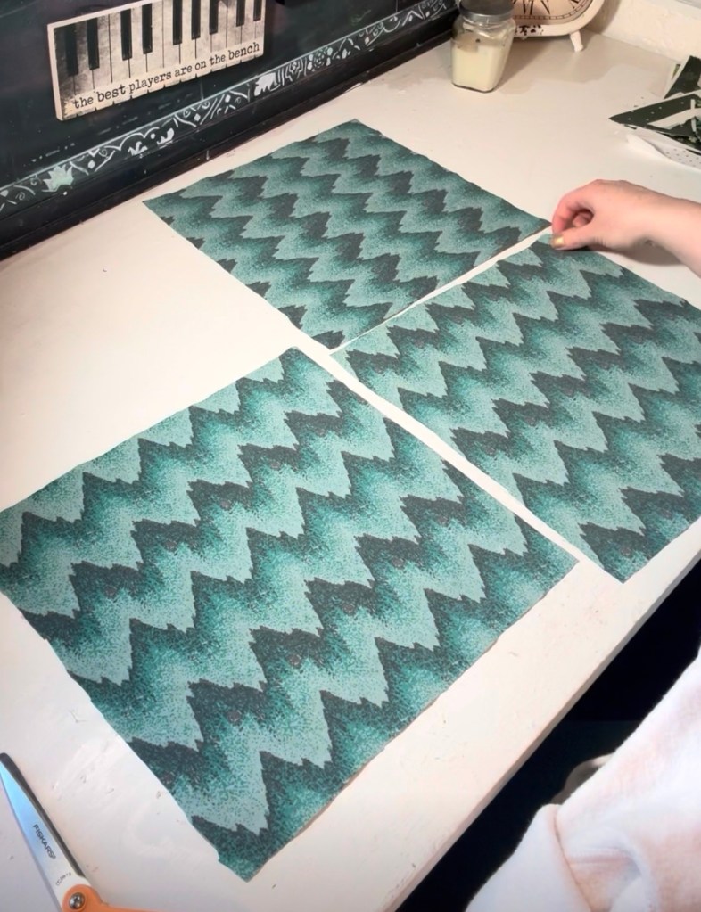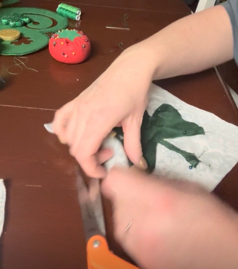 I started by cutting three squares from the green sheet, each measuring 12 x 12 inches. These would become the backing and border for each potholder.