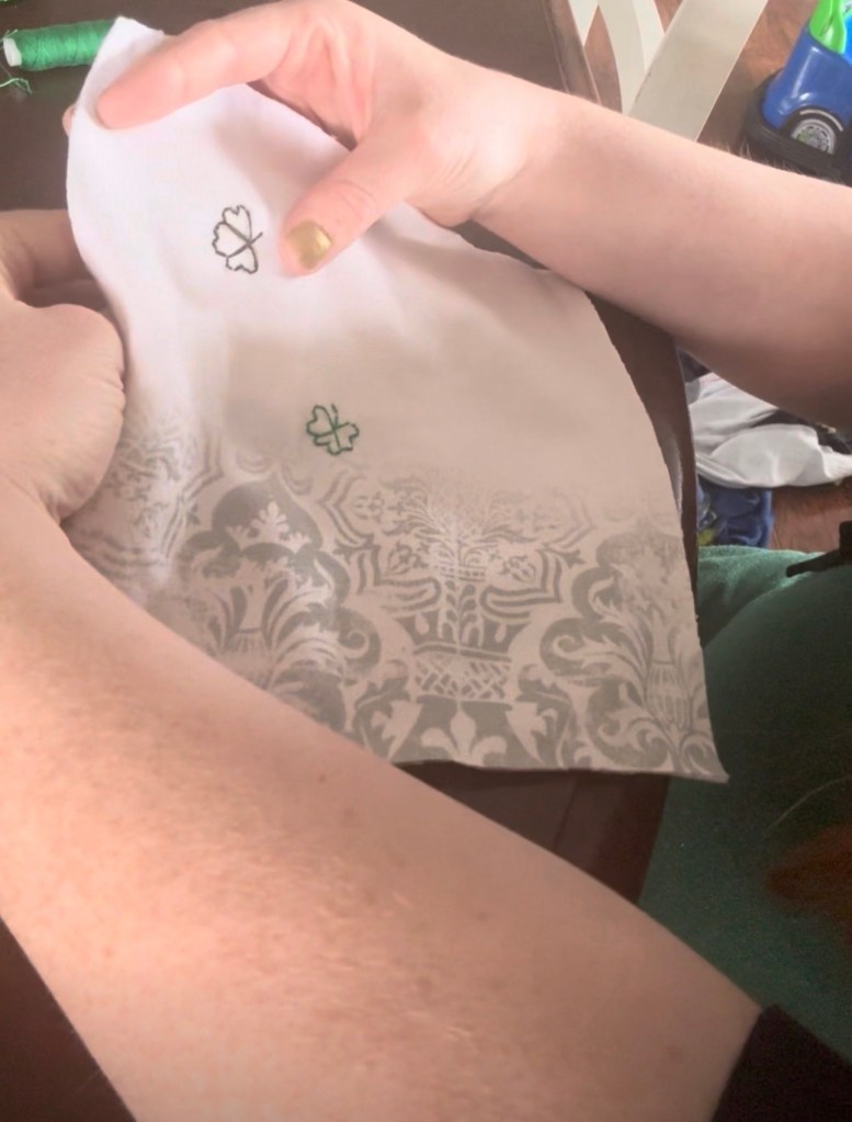 One Hand-Stitched Shamrock Potholder For the third potholder, I decided to change things up. Instead of appliqué, I freehand cross-stitched small shamrocks all over the front. This one took a little longer but added such a charming handmade touch.