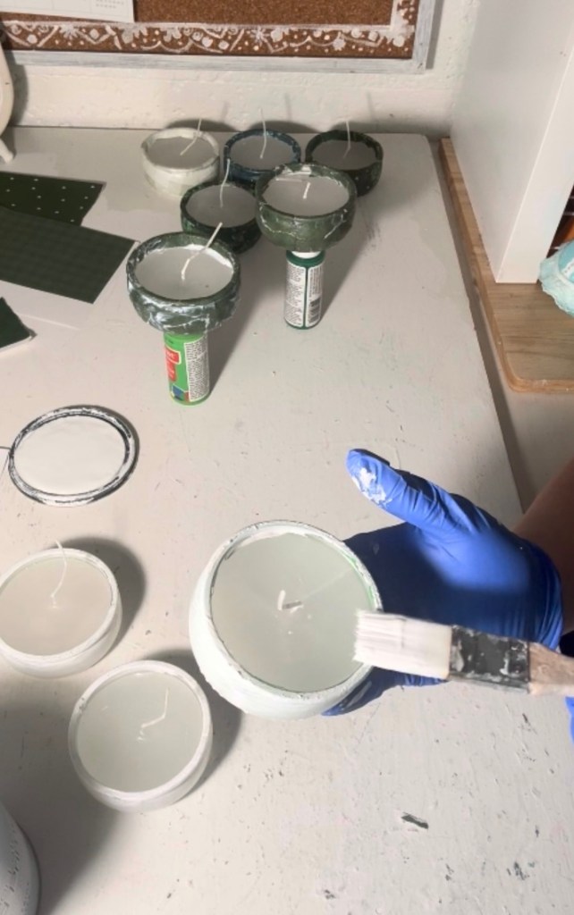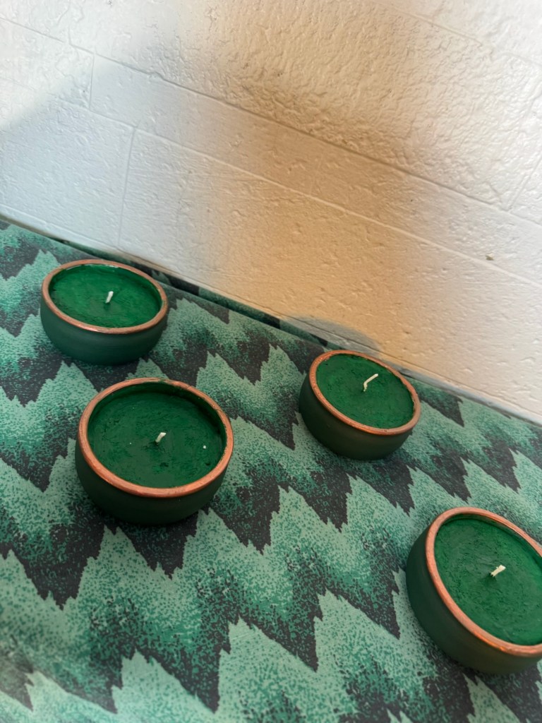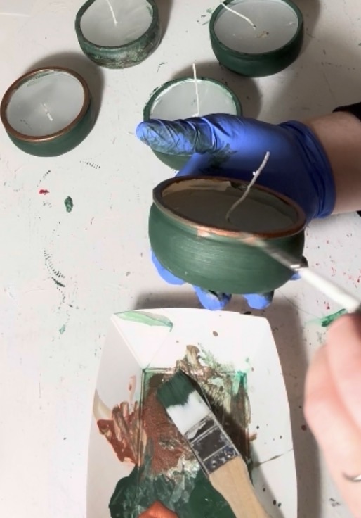 Since I originally wanted dark green wax, I decided to add a little color to the top. I melted a dark green crayon and lightly brushed the melted wax over the tops of the candles.