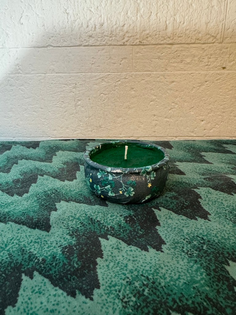 I had a few small flat glass jars left over from a dessert and didn’t want to throw them away. They seemed like the perfect size for small candles, and since I needed a few more decorations for St. Patrick’s Day, I decided to turn them into festive candles instead.