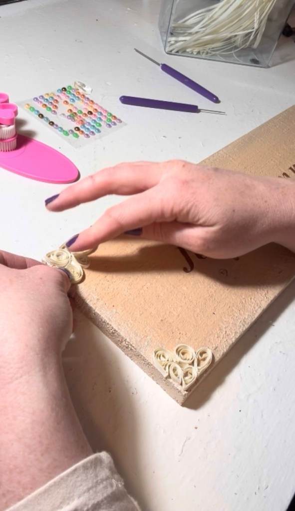 I didn’t want the sign to feel too plain, so I added texture using paper quilling. I cut cream-colored paper into thin strips (you could use a shredder or scissors) and started forming soft swirls and circles.