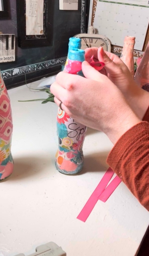 Hot glued a soft pink ribbon around the top of each bottle Added some pretty flowers inside