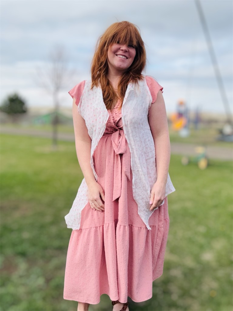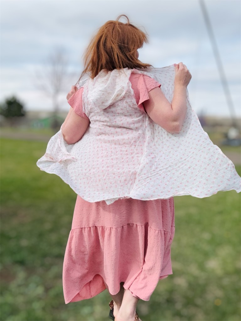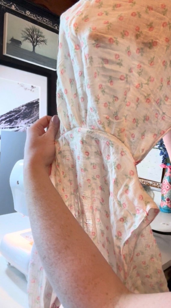 I had this really pretty, lightweight fabric sitting around. It’s almost see-through with soft pink floral patterns—perfect for spring. I didn’t want anything structured or complicated, so I decided to make a flowy shrug-style vest.